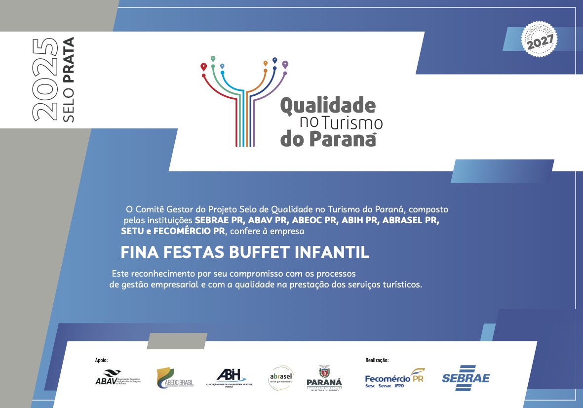 Em 2025, recebemos o Selo Prata de Qualidade Sebrae, com 92 pontos de excelência, em reconhecimento à qualidade dos serviços prestados pelo Fina Festas!