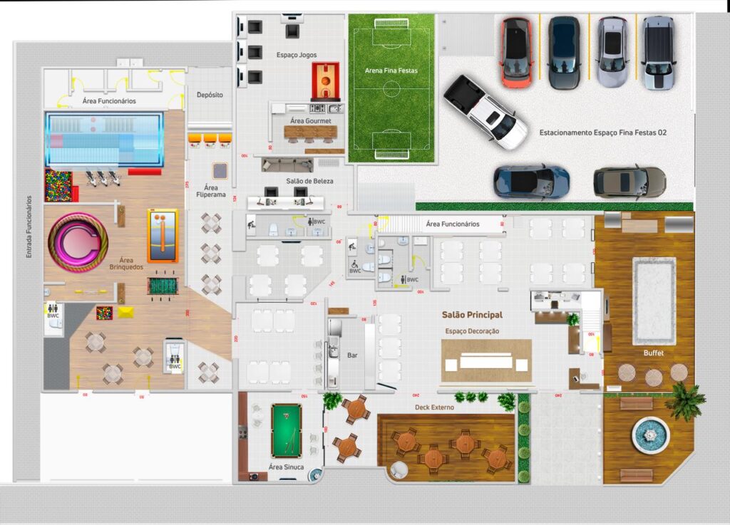 A estrutura é moderna e aconchegante, incluindo um espaço divertido para as crianças com um brinquedão de 9 metros de comprimento com tobogã, cama elástica, 2 circuitos e área baby, que garante diversão para as crianças durante toda a festa, temos também o tombo legal e muitos eletrônicos como o Realidade virtual, Mario Bross, Sonic e muito mais.